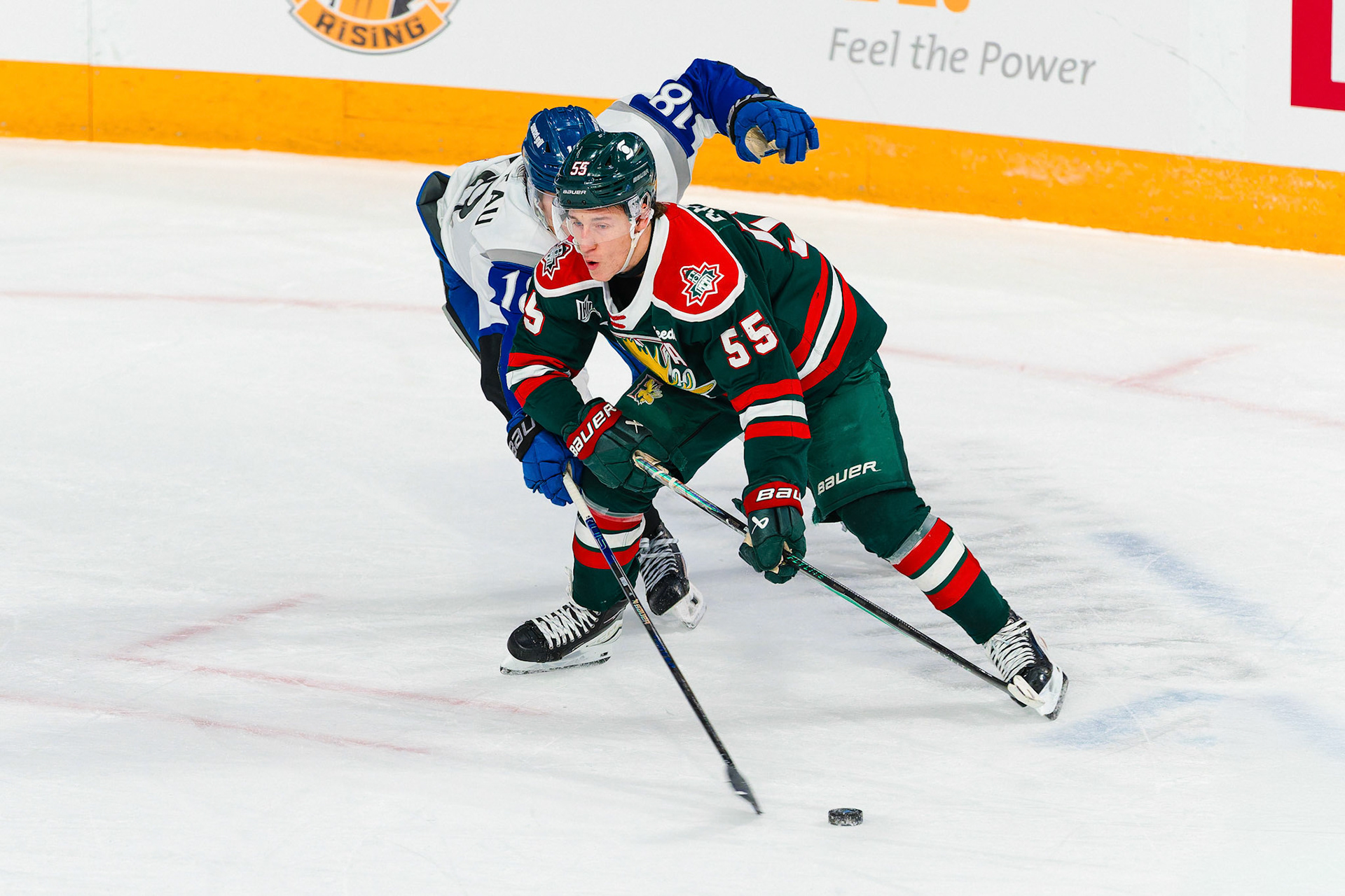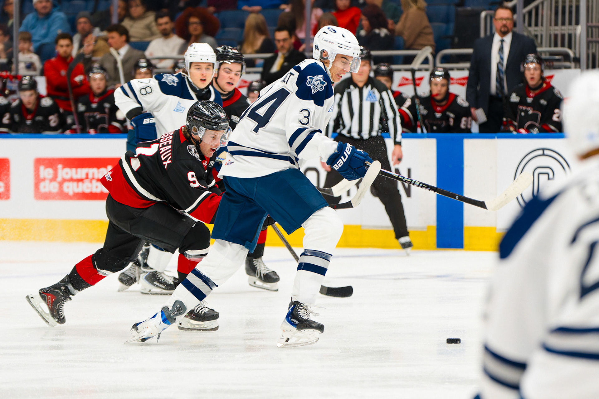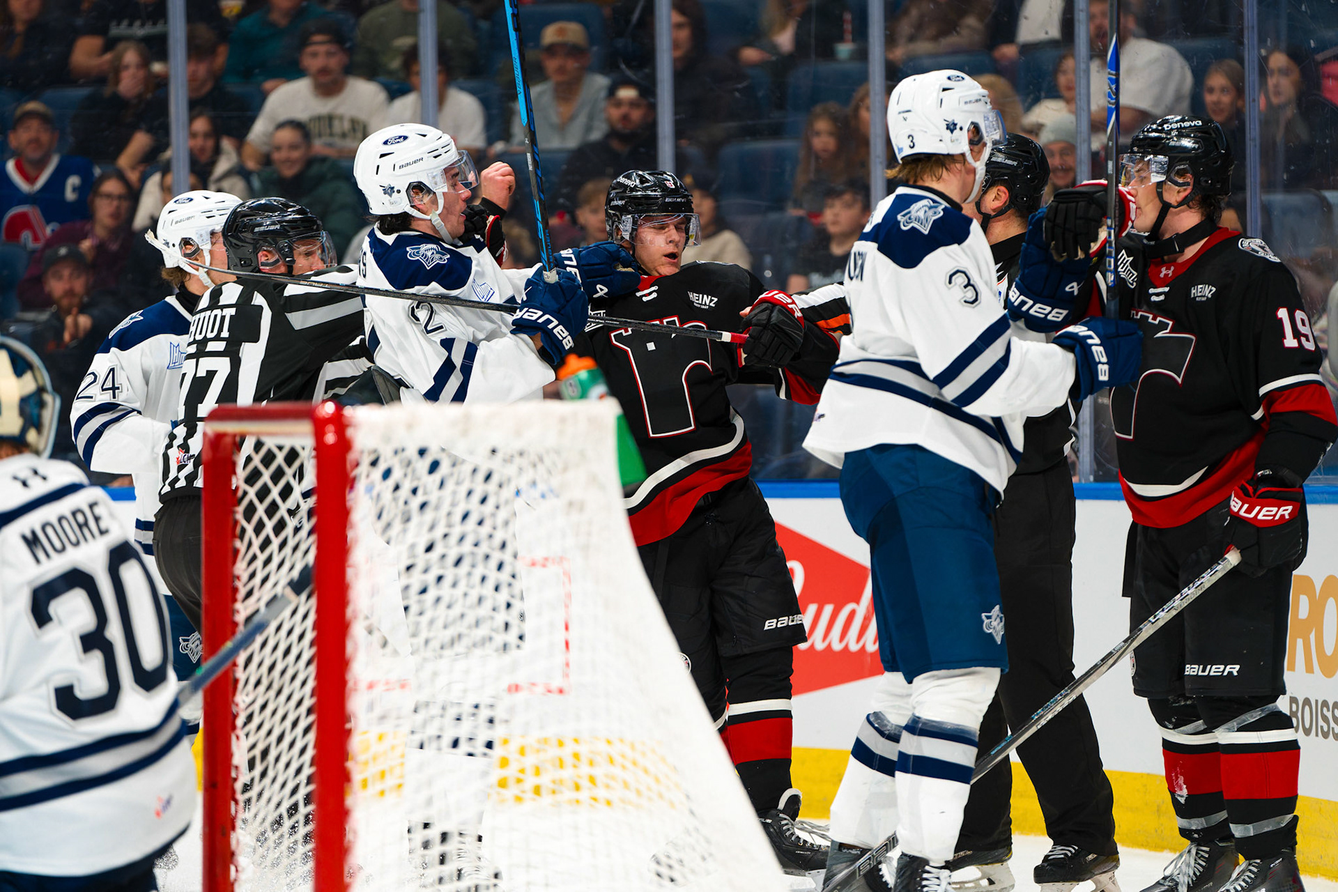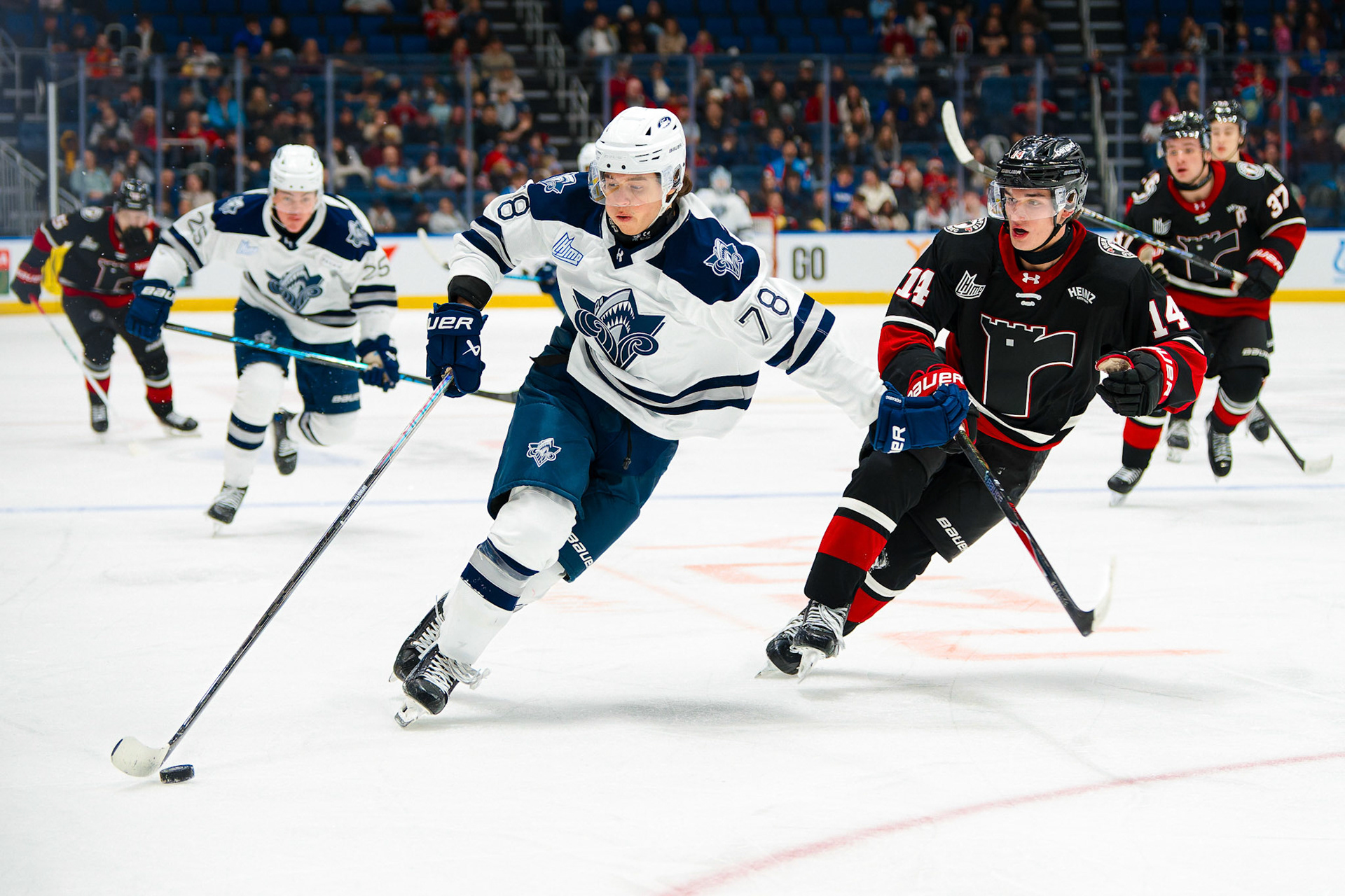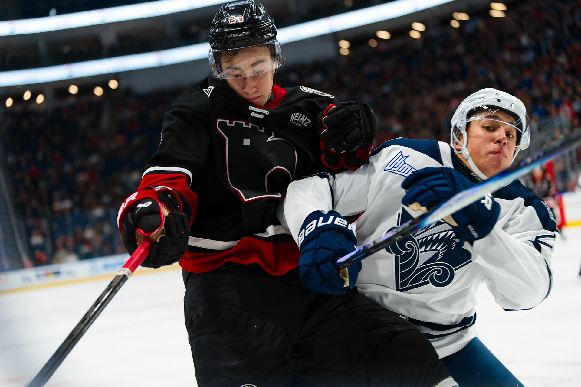 Halifax, Nova Scotia – Eddy Doyle (#51) of The Halifax Mooseheads celebrates his overtime winning goal against the Saint John Sea Dogs at Scotia Bank Centre on December 18th, 2025. Doyle scores in OT, then celebrates with teammates as a fan records the moment on their phone during the post-goal chaos.
